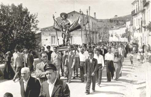 Festa di san Rocco, anno 1958 - Via Roma, nei pressi del ponte. In primo piano è il vigile Giuseppe Carsillo (Mstazzon'), alle spalle Agostino Lodise, Sul lato sinistro è Giovanni Orlando, Il vigile Giangrieco (Capisc), portano la statua il dott. Giambattista Carsillo e Natalino Lo Russo. Verso destra è (masucc'). (Foto di Raffaele Izzo).